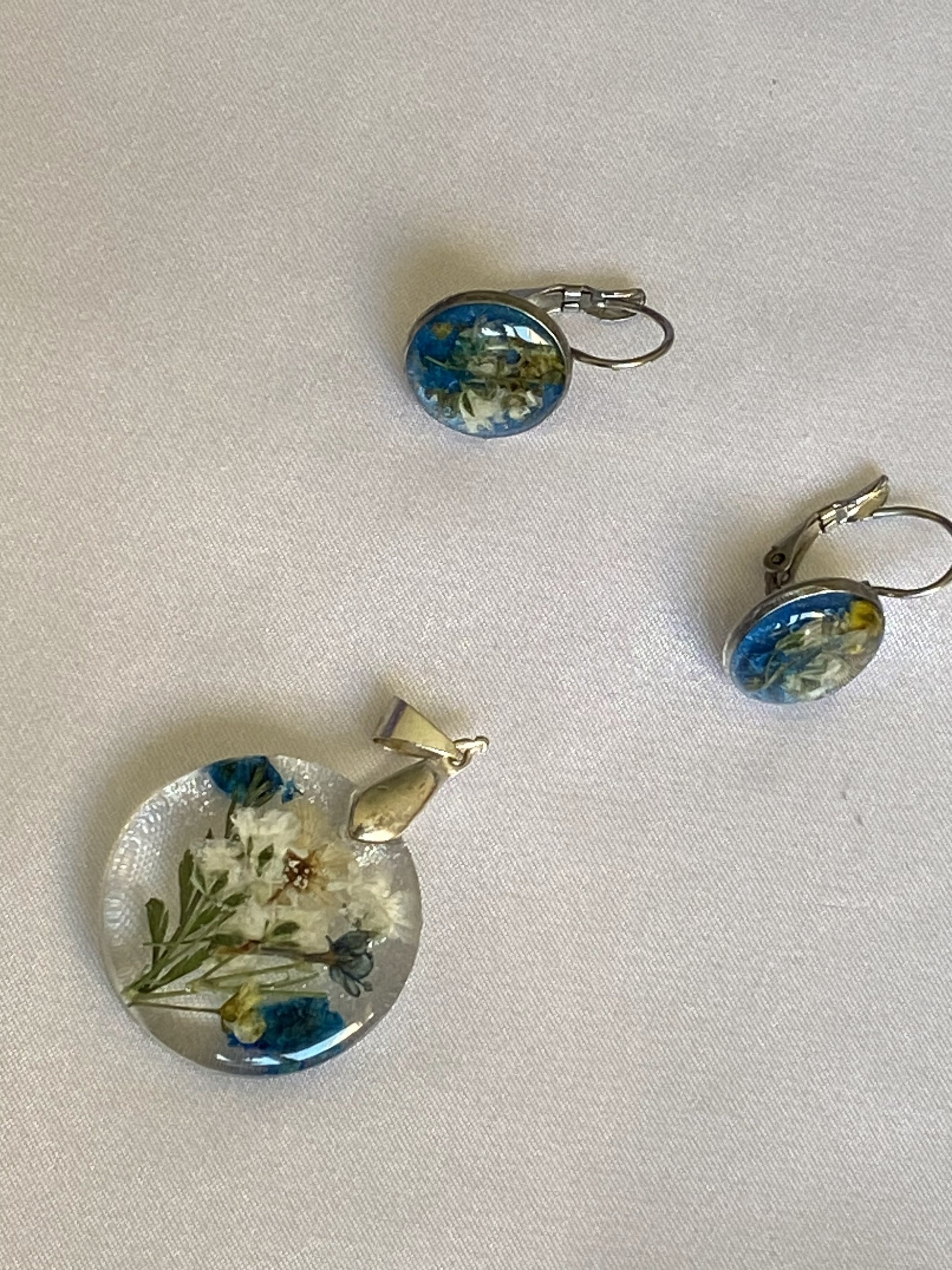 Conjunto de pendente e brincos de mola, produzido com resina e flores naturais, com tons de azul, verde e branco.