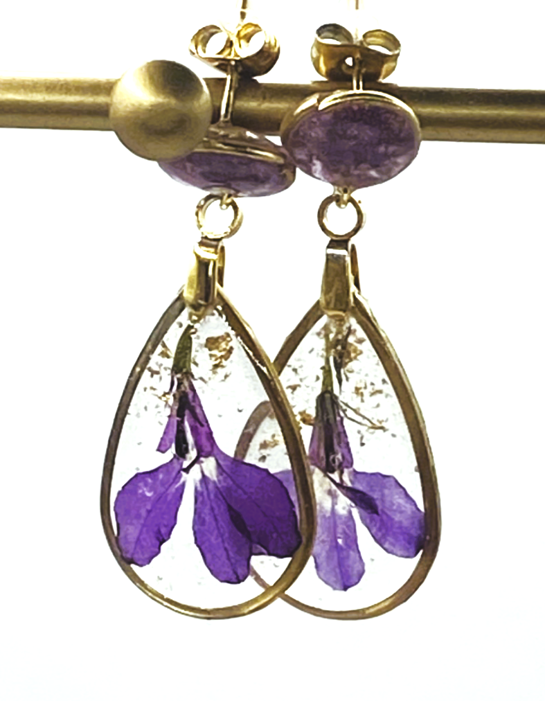 Brincos duplos, com predomínio da cor lilás das flores que o incorporam e com folha de ouro.