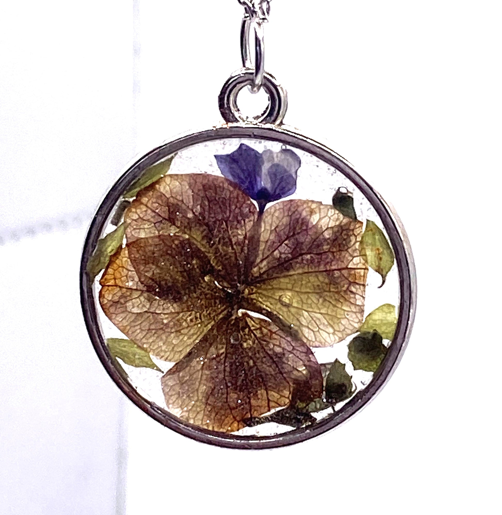 Numa combinação de diferentes tons e tamanhos de hortênsia, este pendente é ideal para o dia a dia.